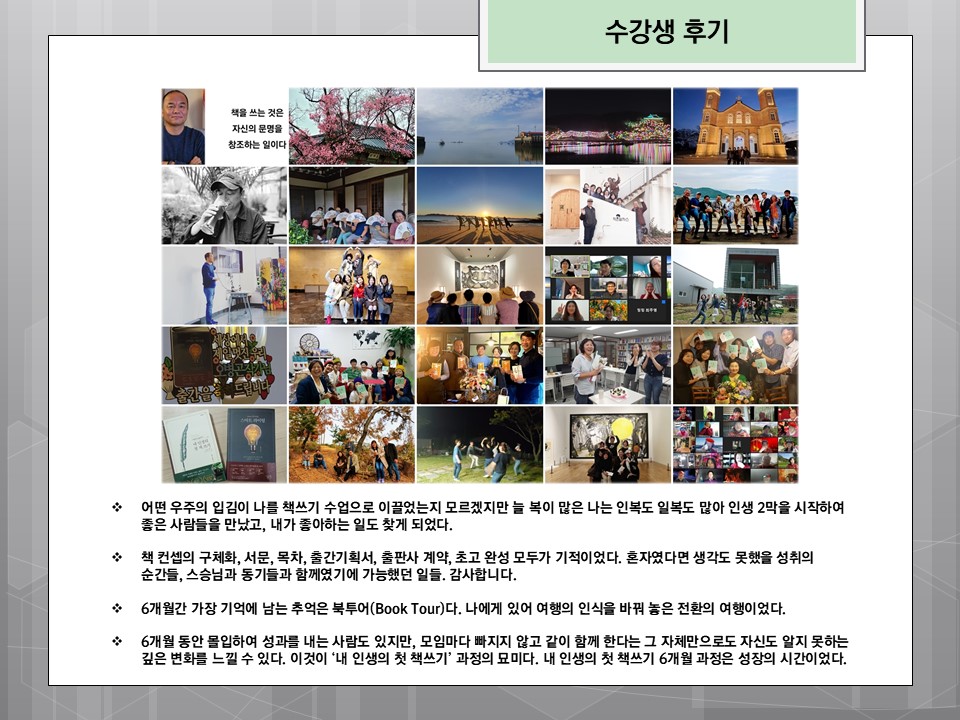 여러분과 함께 6개월 동안 온라인과 오프라인 수업을 병행하여 프로그램을 운영할 것이며, 수강생 1:1 코칭을 강화하고 출간기획서를 조기에 확정하도록 하겠습니다. 또한 북투어(저술여행)을 통해 밀도 있고 즐거운 수업이 되도록 할 예정이며 좋은 출판사와 연계를 강화하겠습니다.